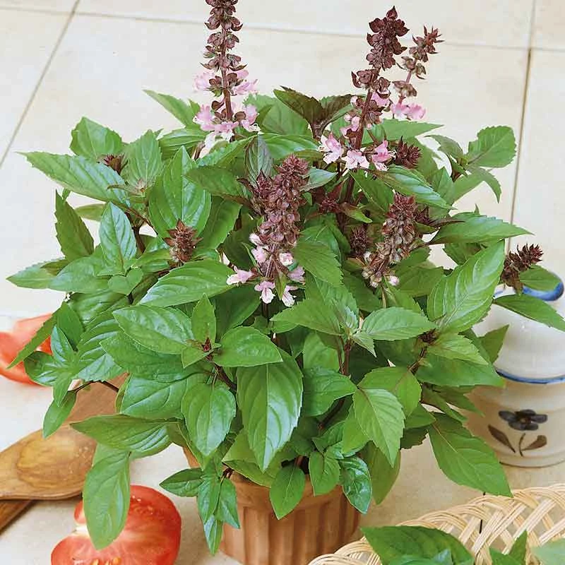 Whew – if you like the aroma of Cinnamon, then Cinnamon basil is a must for your garden and your table. This basil is a cultivar of sweet basil and adds a unique and zesty punch to a variety of dishes as well as teas and fruits.
