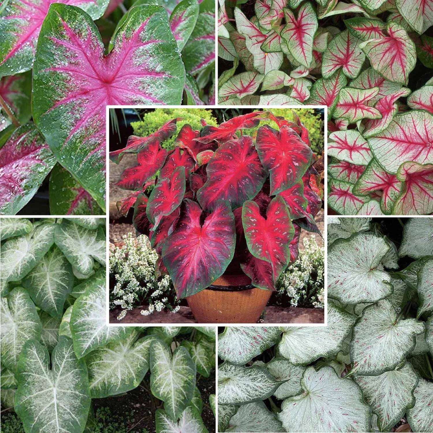This mix combines sun tolerant Caladium varieties! Featuring a beautiful combination of colorful and textural plants that are sure to be a delight in your garden bed, containers, indoors or even in the water garden! There’s practically no place you can’t grow these gorgeous bulbs – except in the cold! Be sure to lift outdoor caladium in early fall.