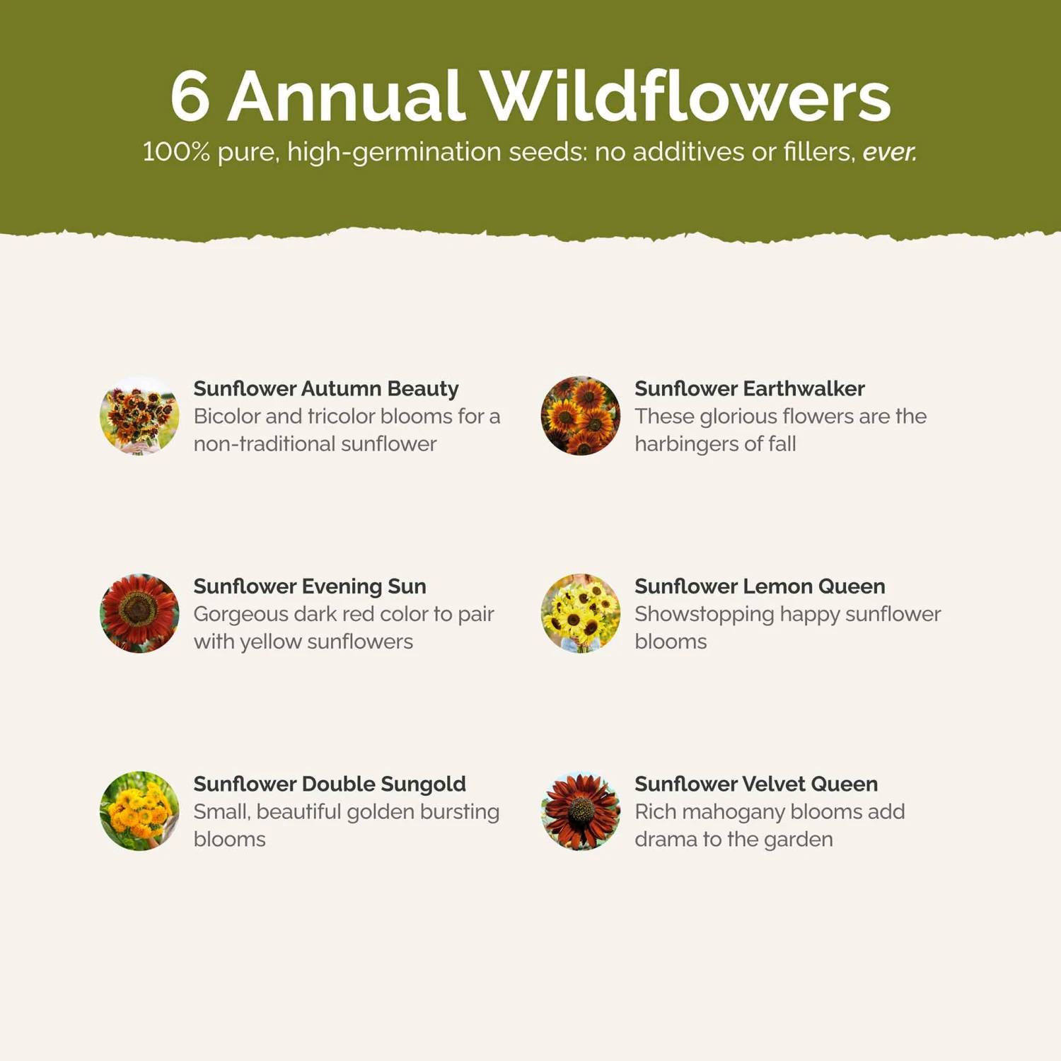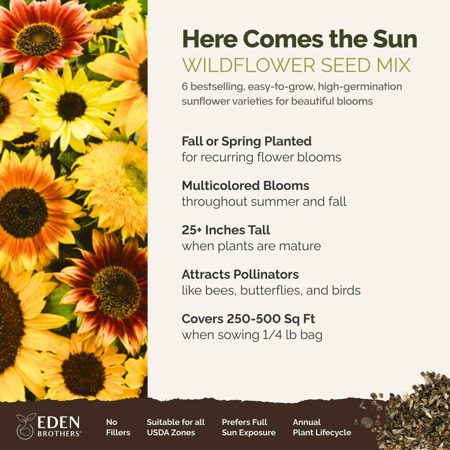 Here come the sunflowers, just like their namesake – the famous Beatles song. This mix features a diverse array of gorgeous sunflowers to give your garden a bright summer look, blended with unique varieties to make this a must-have for sunflower lovers. The Here Comes The Sun Mix shows off a broad spectrum of shapes, sizes and colors to create a beautiful medley of sunflowers.