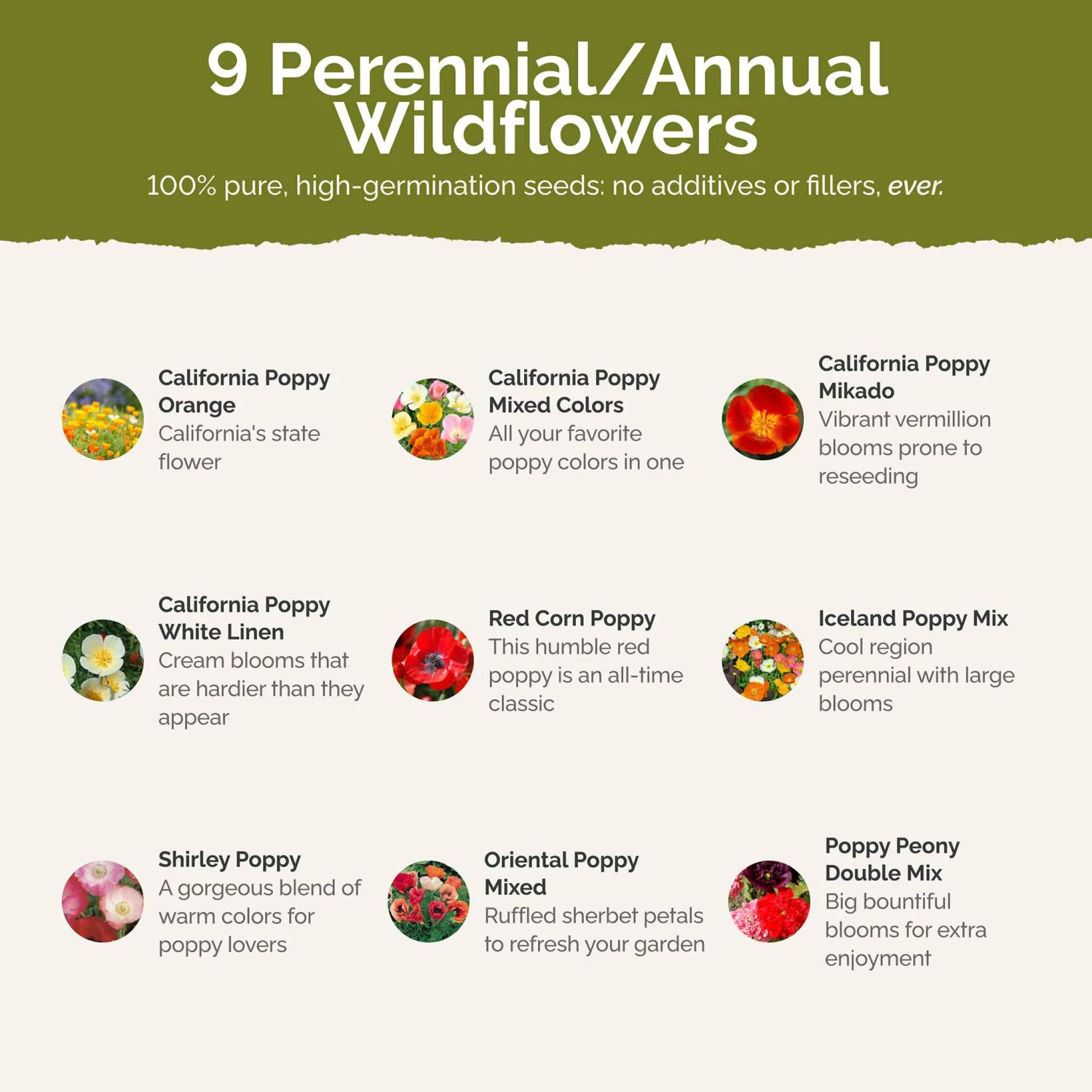 Everybody seems to love poppies, and we have formulated this mix specifically with the poppy enthusiast in mind. This mix has it all—Corn poppy, Shirley poppy, various hues of California Poppy, Oriental poppy, and Iceland poppy! This one is sure to dazzle! Suitable for all regions of North America.